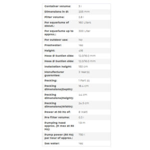 Κατανάλωση : Mόνο 5 Watt σε ισχύ αντλίας 600 λίτρων ανά ώρα και 8 Watt στα 750 λίτρα ανά ώρα.